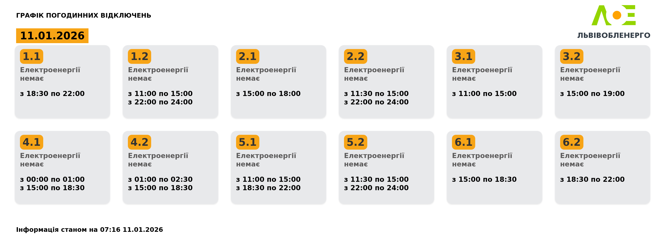 Згідно з графіком від Львівобленерго на 11 січня 2026 року (станом на 07:16), загальна кількість годин без електроенергії для кожної групи становить:
