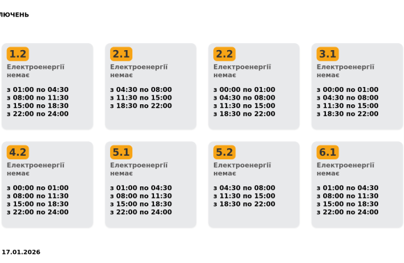 Відключення електроенергії тривають переважно по 3,5 години поспіль. Сумарний час без світла впродовж доби становить від 10 до 12,5 години - залежно від групи.