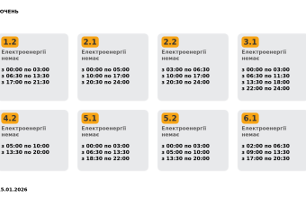 Група 1.2. Електроенергії немає з 00:00 до 03:00, з 06:30 до 13:30, з 17:00 до 21:30.