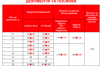 Зокрема, в середньому на дві-п’ять гривень змінюються тарифи на доставку до відділення документів і посилок вагою від 0,1 до 10 кг та від 20 до 30 кг. Також оновлено розмір доплати за адресну доставку документів і посилок – в залежності від ваги відправлення вона зміниться на п’ять-двадцять гривень.