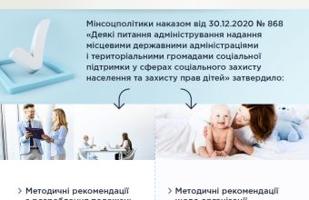 Для забезпечення єдиного підходу щодо методологічного підходу до виконання повноважень з питань соціального захисту населення та захисту прав дітей територіальними громадами Мінсоцполітики розроблено Методичні рекомендації щодо організації та забезпечення діяльності територіальної громади у сферах соціального захисту населення та захисту прав дітей, які затверджено наказом Мінсоцполітики від 30.12.2020 № 868 .