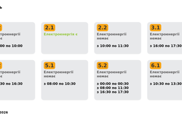 Група 5.2. Електроенергії немає з 00:00 до 00:30, з 08:00 до 11:30, з 16:30 до 17:30.