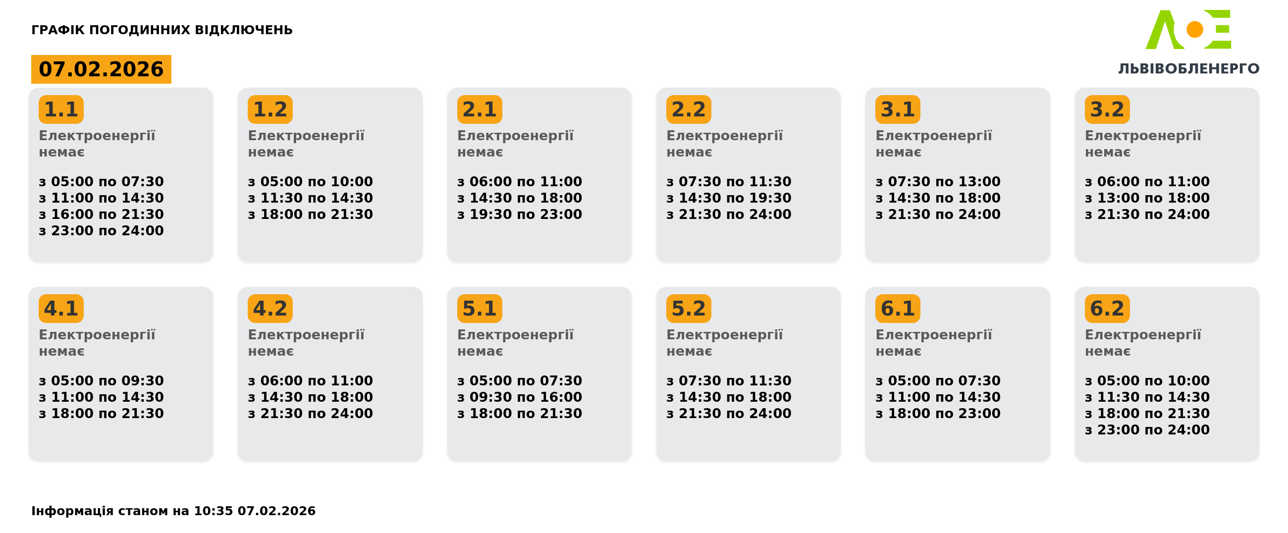 Укренерго склало новий графік погодинних відключень на 07.02.2026 після масованої атаки на енергосистему, пише DailyLviv.com.