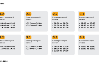 | 3.1 | 02:00–05:30, 12:30–16:00, 23:00–24:00 | 02:00–05:30, 12:30–16:00, 23:00–24:00 | Без змін |
