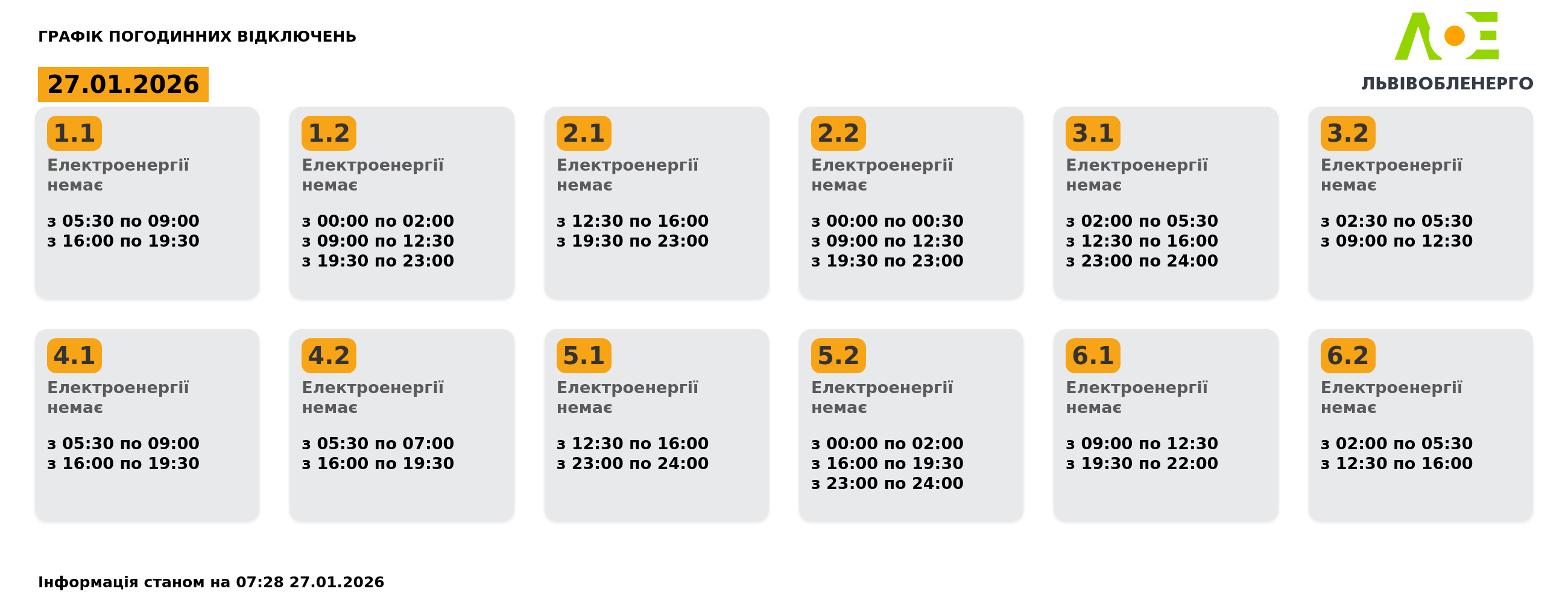 Графік погодинних відключень на 27.01.2026 станом на 07:28: