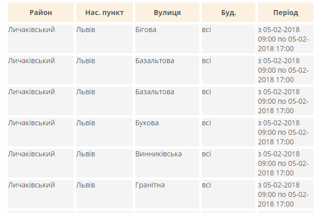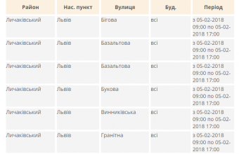 У Личаківському у Залізничному районі Львова «Львівобленерго» знеструмило до 17:00 вулиці Бігову, Базальтову, Букову, Винниківську, Гранітну, Дріжджову, Зборівську, Милорадович, Поетичну, Полудневу, Поморянську, Січневу, Стешенка та Ялівець і будинки №№222-228 та №№253-281 Личаківській, №1, №3 та №№9 Майорівка, №65, №67 та №69 Медової Печери, №№104-137 Тракт Глинянський. А у Франківському районі Львова обленерго знеструмило до 17:00 будинки №№51-75 на вулиці Володимира Великого, №96а, №96б, №104 та №110 на вулиці Науковій і №№7-13 (непарні) на вулиці Симоненка
