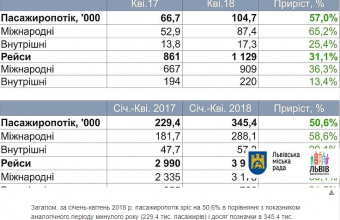 «За січень-квітень 2018 року пасажиропотік зріс на 50,6% у порівнянні з показником аналогічного періоду минулого року (229,4 тисячі пасажирів) і досяг позначки в 345,4 тисячі пасажирів. Кількість рейсів зросла на 32,9% – з 2 990 до 3974. Такі високі показники роботи стали можливими завдяки відкриттю нових напрямків авіакомпаніями «Wizz Air» та «Ernest Aіrlіnеs» у міста Італії, Німеччини та Польщі», – поінформували також у прес-службі Львівської міськради.