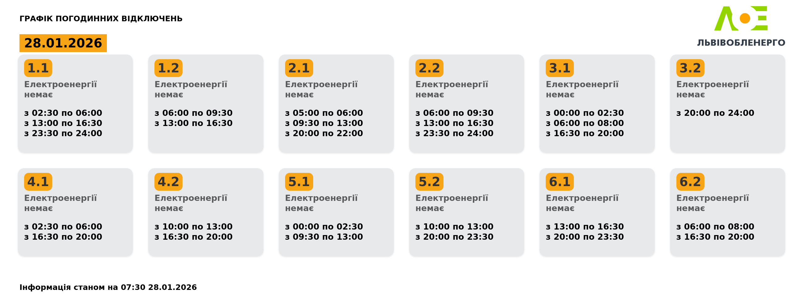 Група 1.2. Електроенергії немає з 06:00 до 08:00, з 13:00 до 16:30.