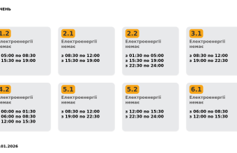 Група 3.1. Електроенергії немає з 08:30 до 12:00, з 19:00 до 22:30.