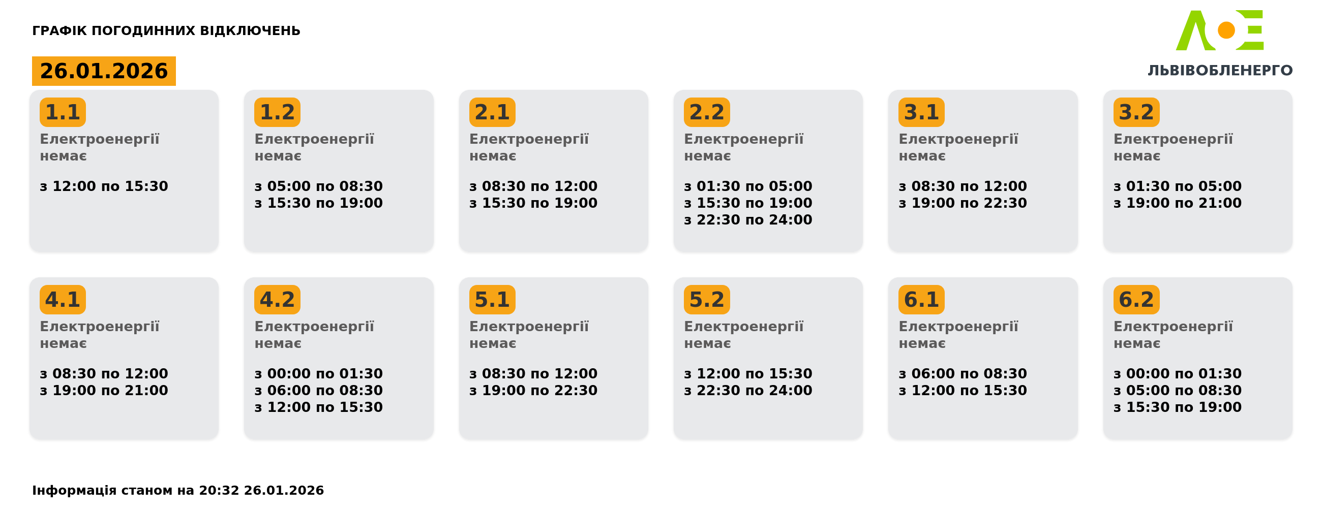 Львівобленерго оновило графік погодинних відключень на 26.01.2026, пише DailyLviv.com.