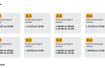Група 1.1. Електроенергії немає з 02:00 до 03:00, з 12:30 до 16:30.