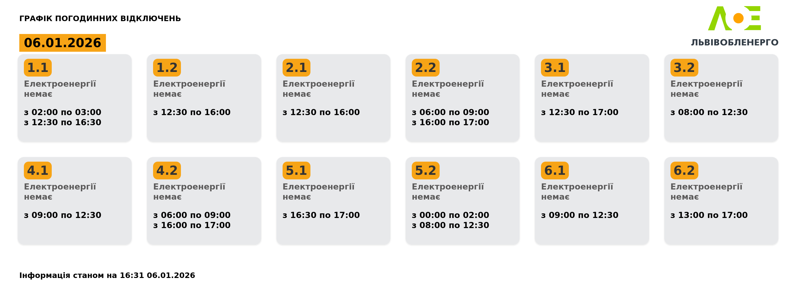 Львівобленерго оприлюднило графік погодинних відключень світла на шосте січня станом на 16:31 06.01.2026 року.