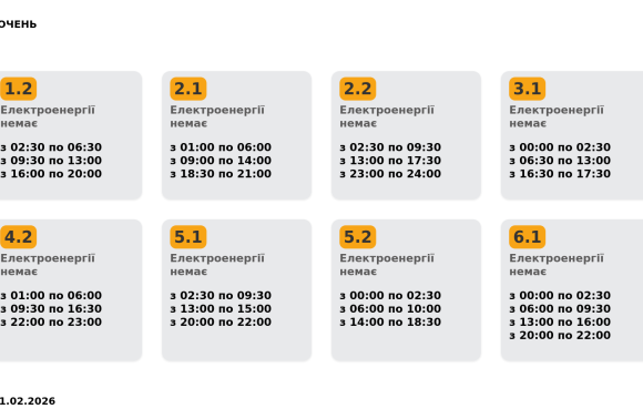 Група 1.2. Електроенергії немає з 02:30 до 06:30, з 09:30 до 13:00, з 16:00 до 20:00.
