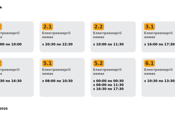 Група 5.2. Електроенергії немає з 00:00 до 00:30, з 08:00 до 11:30, з 16:30 до 17:30.