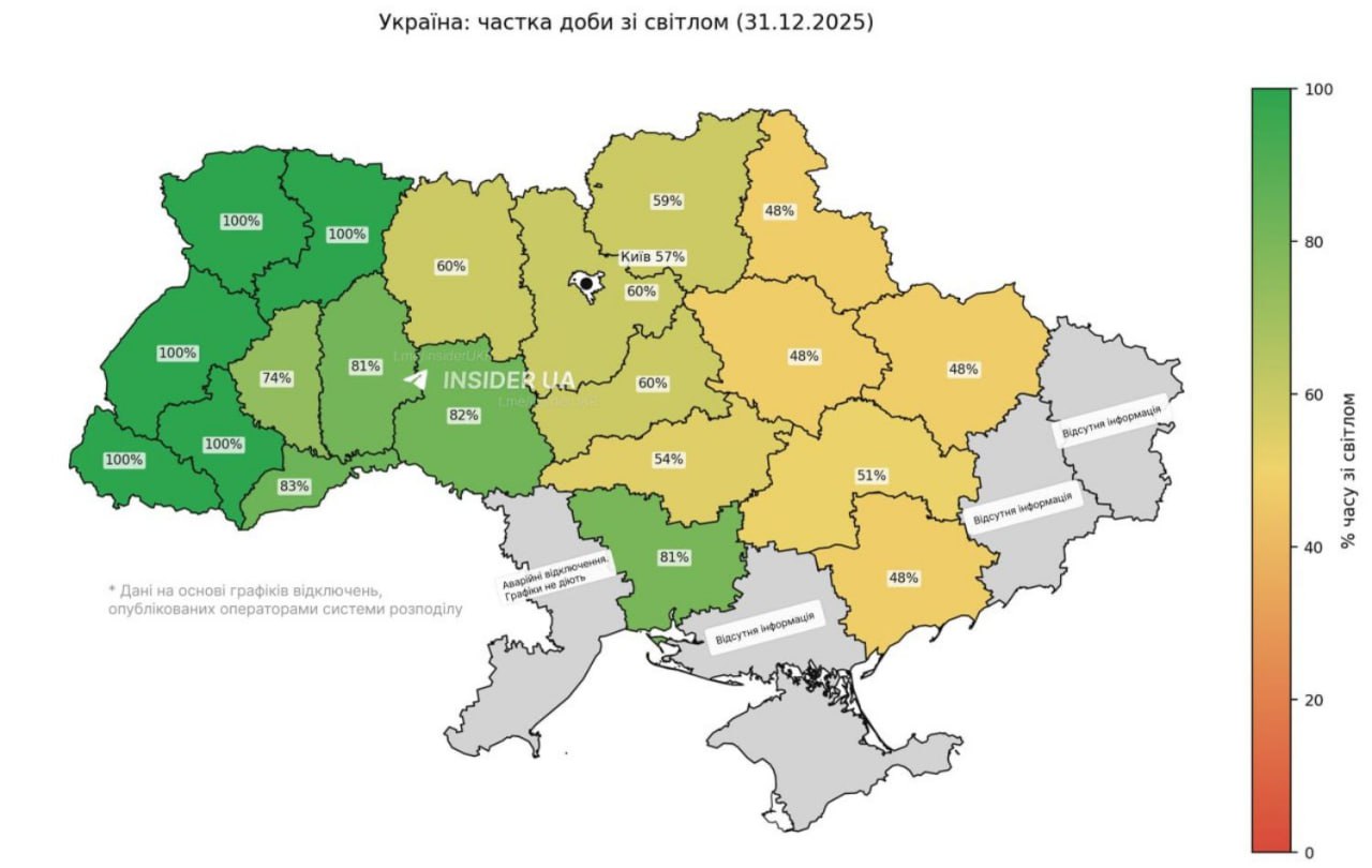 Інфографіку вимкнення електроенергії в Україні перед новорічною ніччю склали моніторингові канали, пише DailyLviv.com.