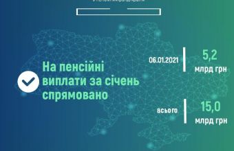 На пенсійні виплати сьогодні спрямовано 5,2 млрд грн. Забезпечено фінансування пенсій січня на загальну суму 15,0 млрд грн.