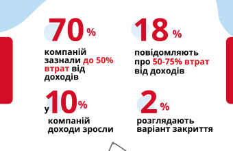 Станом на 7 квітня більшість компаній, а саме 70% опитаних, зазнали до 50% втрат від доходів, ще 18% повідомлять про 50-75% втрат від доходів. Про збільшення доходів повідомляють 10%, ще 2% розглядають варіант закриття.