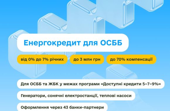 Пільговий кредит від 0% ОСББ можуть оформити в 43 банках-партнерах програми «5–7–9%». Сума — до 3 млн грн, термін — до 3 років.
