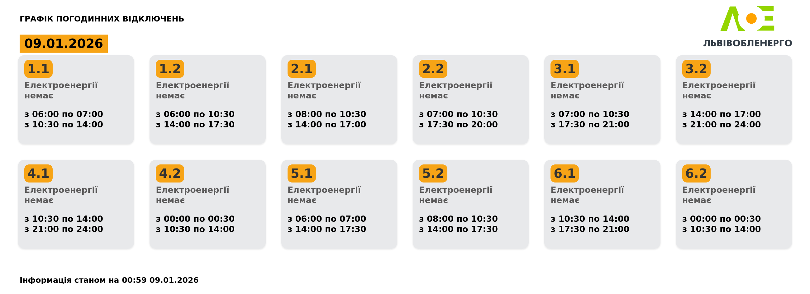 Графік погодинних відключень на 09.01.2026, інформація станом на 00:59 09.01.2026.