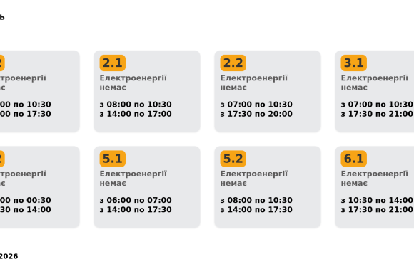 Група 5.2. Електроенергії немає з 08:00 до 10:30, з 14:00 до 17:30.