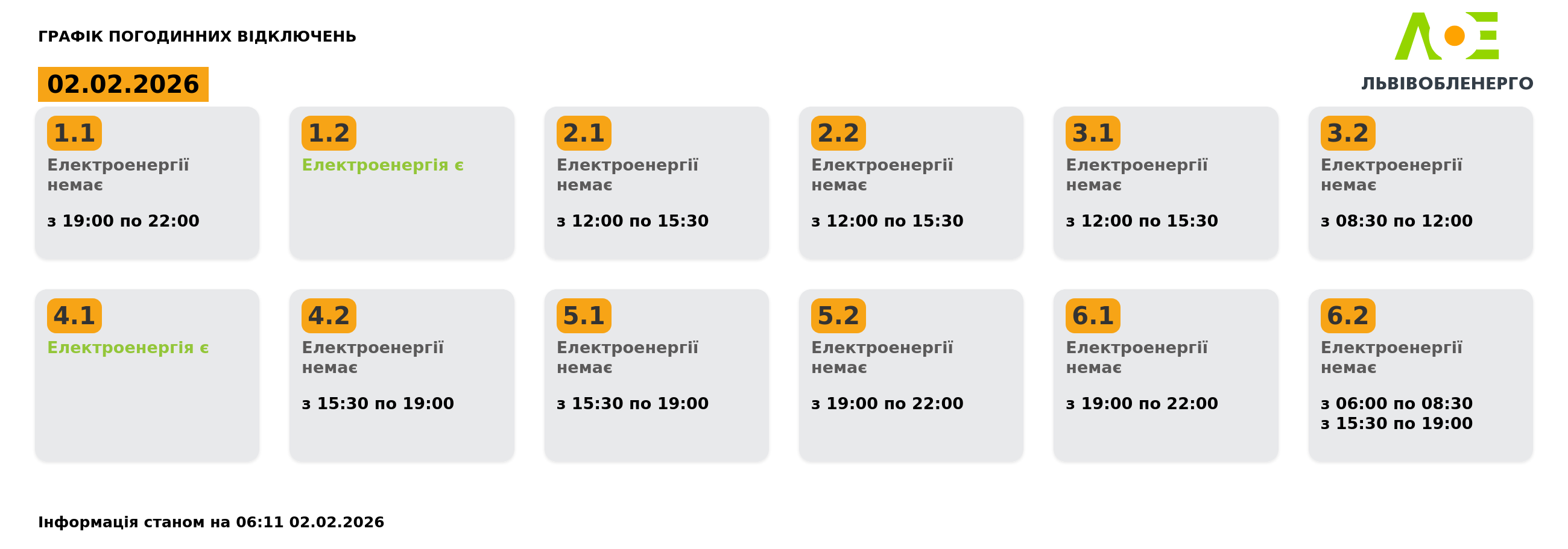 Група 6.2. Електроенергії немає з 06:00 до 08:30, з 15:30 до 19:00.