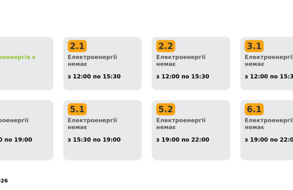 Група 6.2. Електроенергії немає з 06:00 до 08:30, з 15:30 до 19:00.