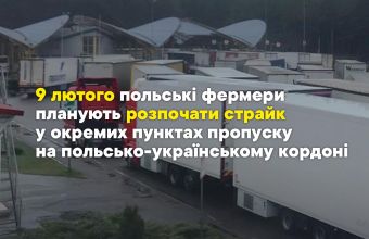 Державна митна служба попередила міжнародних перевізників про те, що, за попередньою інформацією польської сторони, місцеві фермери планують розпочати страйк у окремих пунктах пропуску на польсько-українському кордоні вранці 9 лютого. Про це інформує пише DailyLviv.com.