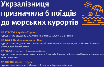 „Укрзалізниця“ запустила шість поїздів до курортних міст. Поїзд №86/85 Львів - Новоолексіївка поїде зі Львова 5 липня.