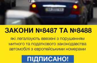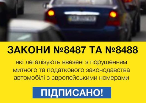 Президент України Петро Порошенка підписав закони №8487 та №8488, які легалізують ввезені з порушенням митного та податкового законодавства автомобілі з європейськими номерами.