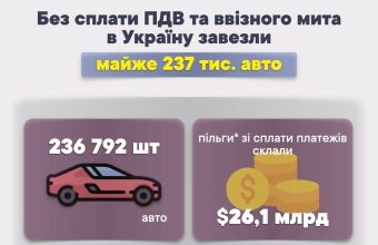 За ввесь час так званого “нульового” митного оформлення автівок, що тривав у квітні-червні 2022 року, ввезено майже 237 тис. транспортних засобів. Пільги зі сплати платежів склали 26,1 млрд грн.