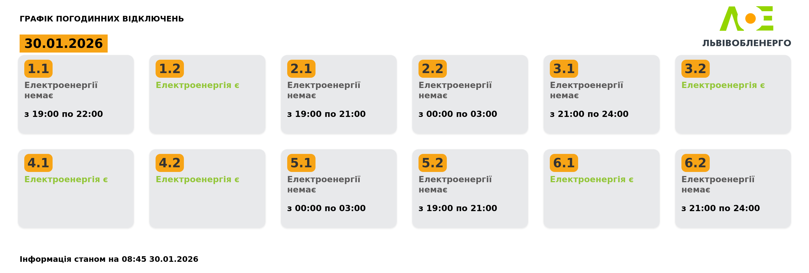 Графік погодинних відключень на 30 січня станом на 08:45: