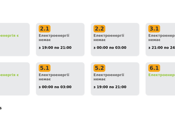 Група 6.2. Електроенергії немає з 21:00 до 24:00.