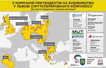 «Претендентами на будівництво заводу із переробки відходів у Львові стали компанії «Control Process S.A.» (Польща), «Eggersmann Gruppe GMBH» (Німеччина), «Helector S.A.» (Греція), консорціум «MUT» (Австрія), «Dogusan» (Туреччина), консорціум «WTT» (Нідерланди) та «Axis» (Литва). Учасники, які пройшли кваліфікацію, незабаром отримають другу частину тендерної документації. Цей етап відбору компаній складатиметься з двох частин», – поінформували також у ЛМР.