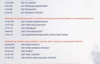 Українські компанії, які прямо чи опосередковано володіють частками у статутних капіталах російських компаній, за період з березня по серпень включно 2022 року, отримали державних замовлень на суму понад 87 млн грн. Серед них: