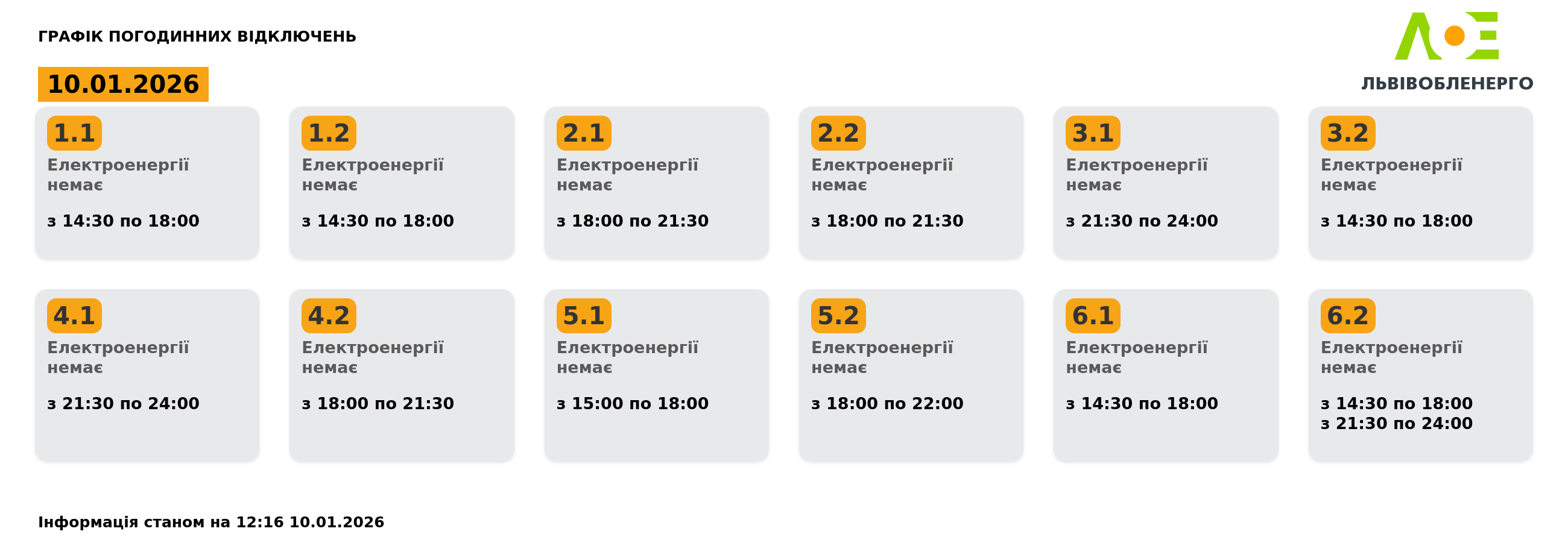 Графік погодинних відключень на 10 січня станом на 12:16: