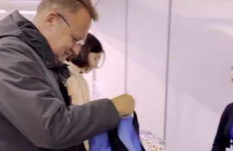 На відео міський голова Львова Андрій Садовий на одному зі стендів придивляється і прицінюється до торбинки, в яку можна складати придбані книжки. І не тільки.