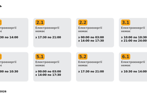 Група 2.2. Електроенергії немає з 00:00 до 03:00, з 14:00 до 17:30.