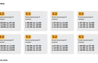 Група 6.1. Електроенергії немає з 05:00 до 07:30, з 11:00 до 14:30, з 18:00 до 21:30.