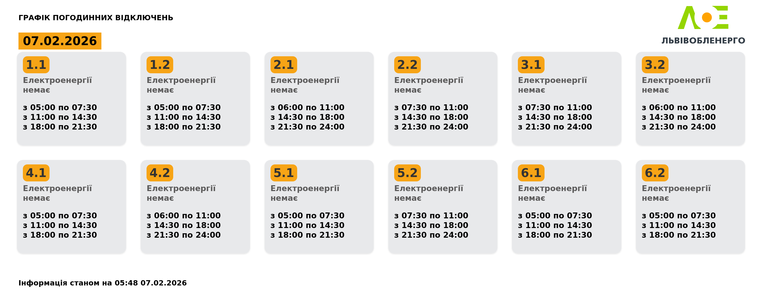 Група 6.2. Електроенергії немає з 05:00 до 07:30, з 11:00 до 14:30, з 18:00 до 21:30.
