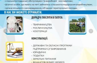 «Працівники центру надаватимуть дорадчі послуги сільськогосподарським виробникам в галузі тваринництва, рослинництва та кооперації. Також аграрії області зможуть проконсультуватись щодо державних та обласних програм підтримки, отримати юридичні консультації, а також консультації щодо земельних питань та податкового законодавства. Щоденно у центрі працюватимуть фахівці із різних сфер дотичних до аграрного сектору», – поінформували також в облдержадміністрації.