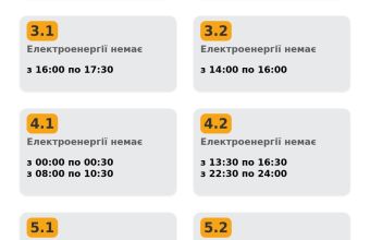 Група 5.2. Електроенергії немає з 00:00 до 00:30, з 08:00 до 11:30, з 16:30 до 17:30.
