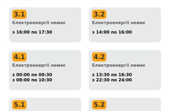 Група 5.2. Електроенергії немає з 00:00 до 00:30, з 08:00 до 11:30, з 16:30 до 17:30.