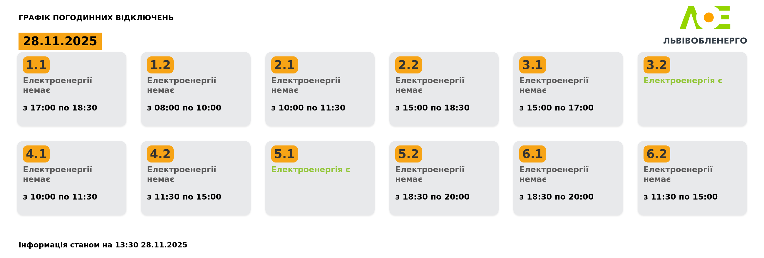 У п'ятницю, 28 листопада, ПрАТ "Львівобленерго" раніше двічі оновлювало графік погодинних відключень електроенергії.