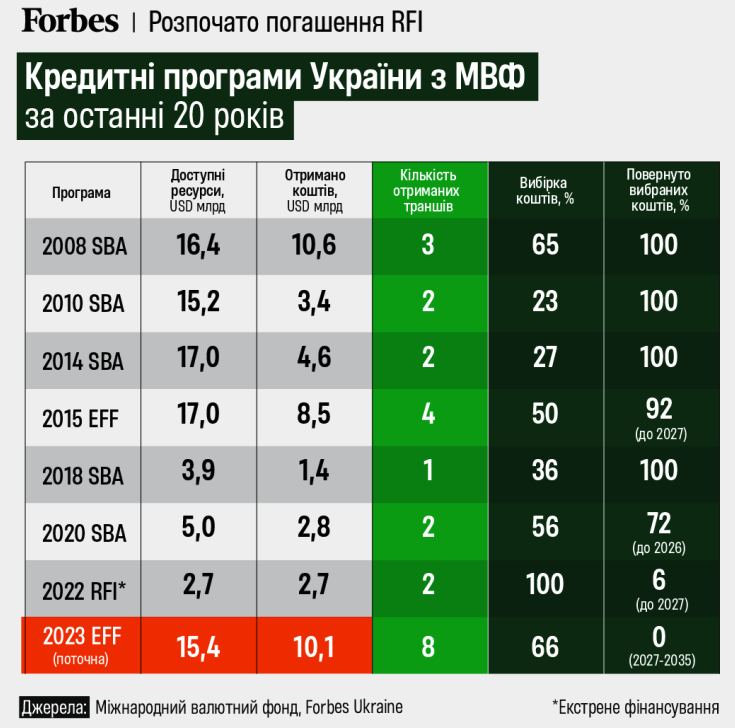 За програмою екстреного фінансування RFI у 2022 році Україна отримала SDR 2 млрд ($2,67 млрд) у форматі двох траншів. Її погашення розпочинається сьогодні та триватиме до жовтня 2027 року. Виплата відбуватиметься через 16 траншів, рівномірно розподілених у часі. Сьогоднішній перший транш, відповідно, означає погашення 6% заборгованості.