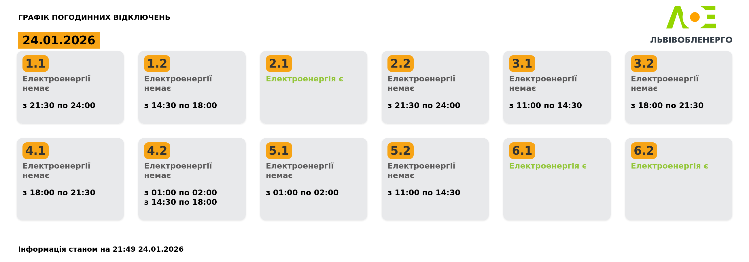 Група 1.1. Електроенергії немає з 21:30 до 24:00.