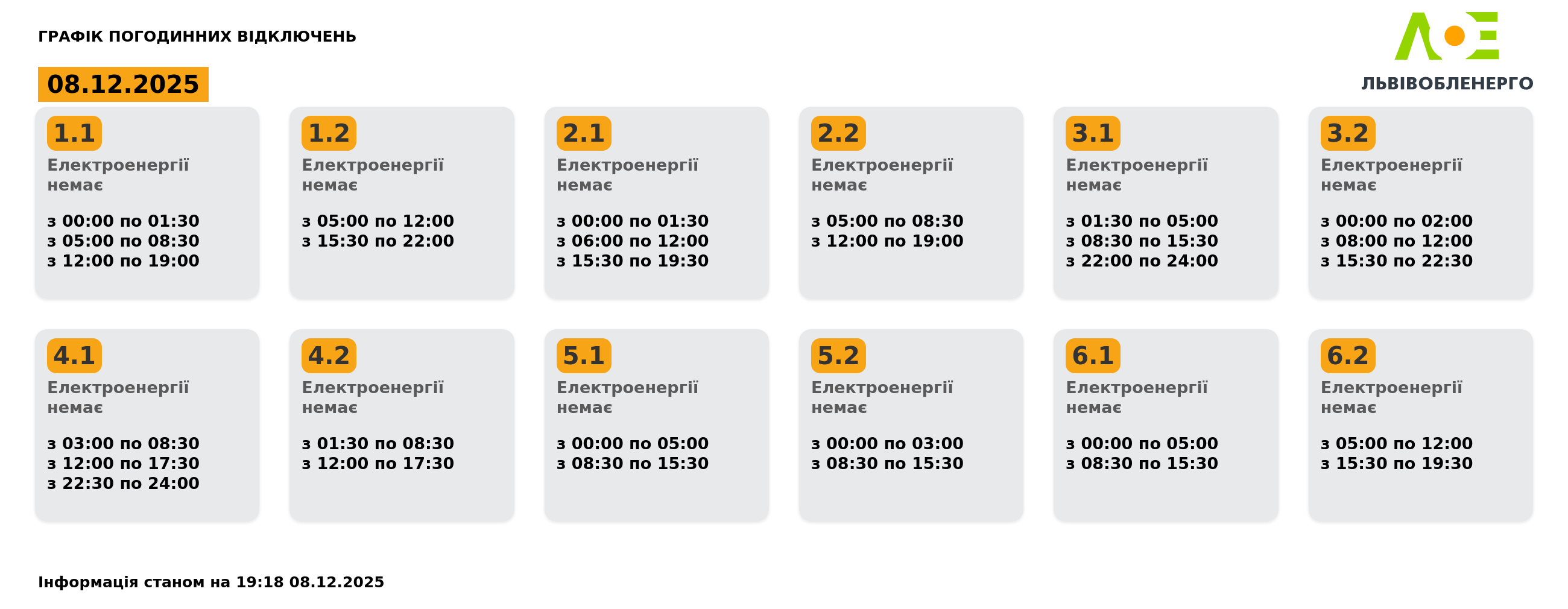 Група 1.1. Електроенергії немає з 00:00 до 01:30, з 05:00 до 08:30, з 12:00 до 19:00.