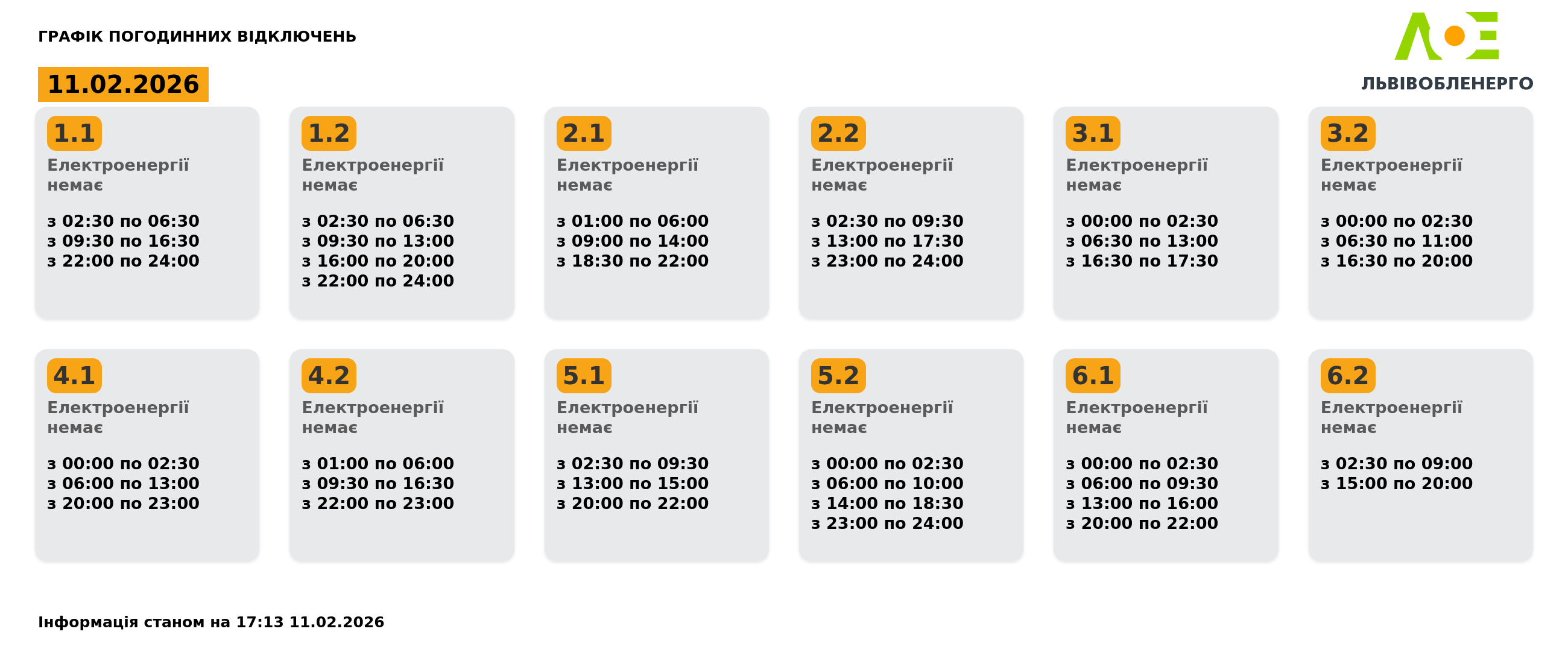 Графік погодинних відключень на 11.02.2026 станом на 17:14: