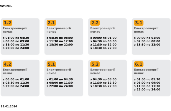 Група 1.1. Електроенергії немає з 01:00 до 04:30, з 08:00 до 11:30.