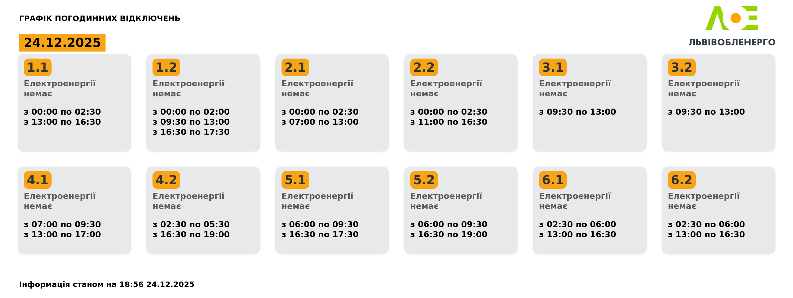 Графік погодинних відключень на 24.12.2025 станом на 18:56 24 грудня: