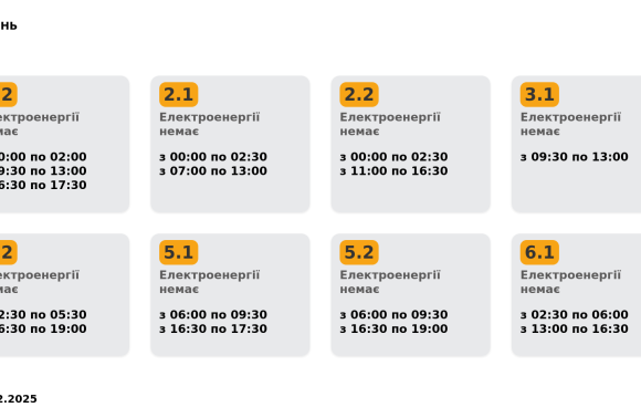Група 6.2. Електроенергії немає з 02:30 до 06:00, з 13:00 до 16:30.